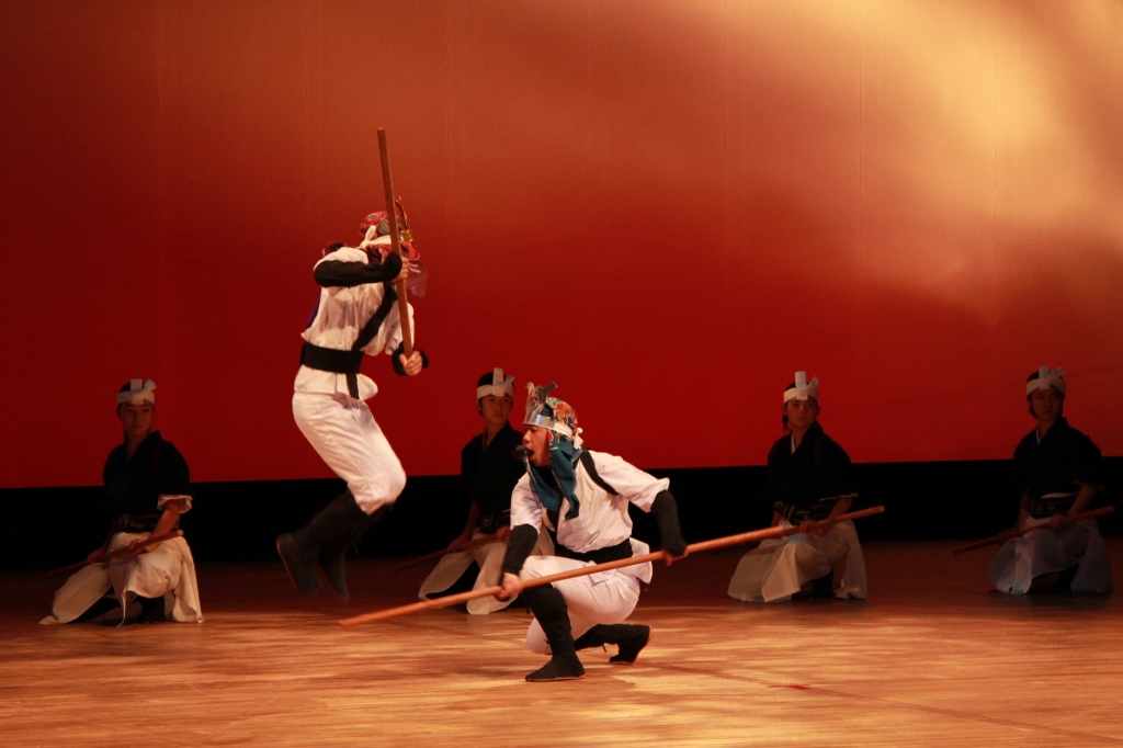 舞台の部で白保中学校は、3年生が「白保の棒術」を演武し、