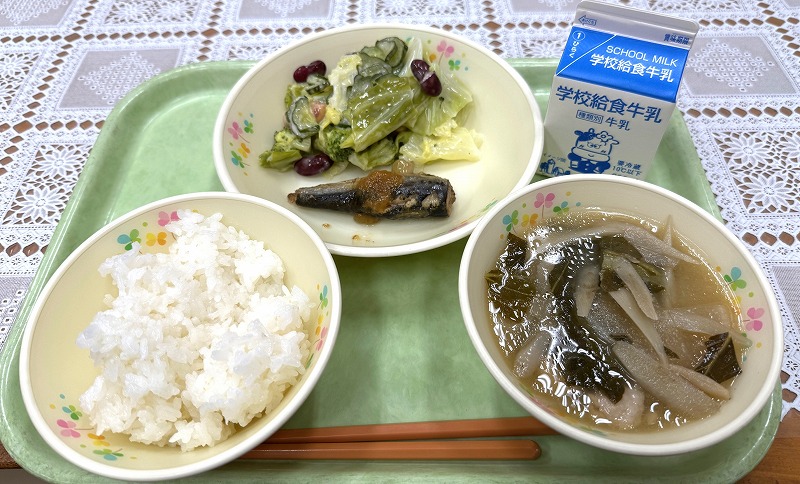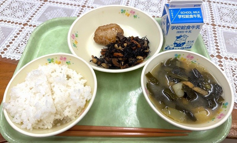 今日の給食です♪ 「ジューシー・千草焼き・ほうれん草の和え物・アーサ汁・牛乳」です♪