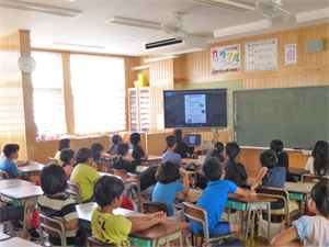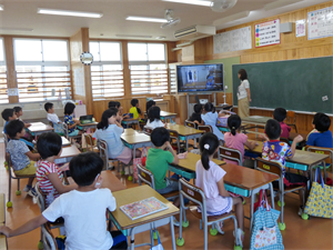 各教室では、子どもたちが動画を視聴し、担任の先生と給食委員会の活動の様子や給食の準備・片付けの約束を確かめていました。