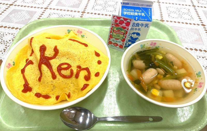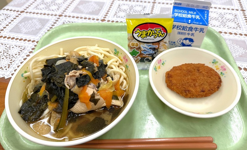 今年、最初の給食です♪ メニューは「青菜雑炊・国産ミートハンバーグ・いんげんのゴマ和え・ポンデドーナツチョコかけ・牛乳」です♪ 今日は少し寒かったので、温かい青菜雑炊が最高~でした♪ 本日も美味しくいただきました♪ ごちそうさまでした(^^)/ 給食センタースタッフの皆様、本年もどうぞよろしくお願いします(^^)/