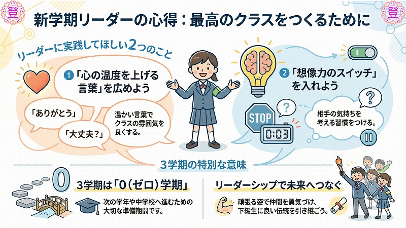 ❸3つめは、「3学期は、ゼロ学期」というお話です。(*新学期のスタートが1学期なので、その前の3学期を「0学期」と呼んでいます) 3学期は、1年間のまとめの学期であると同時に、次の学年に上がるための準備をする学期でもあります。 そこで、3学期は、できないことができるように、分からないところが分かるようにしていきましょう♪ そして、1つ上の学年になる自分を「想像」して自分らしくがんばろう♪
