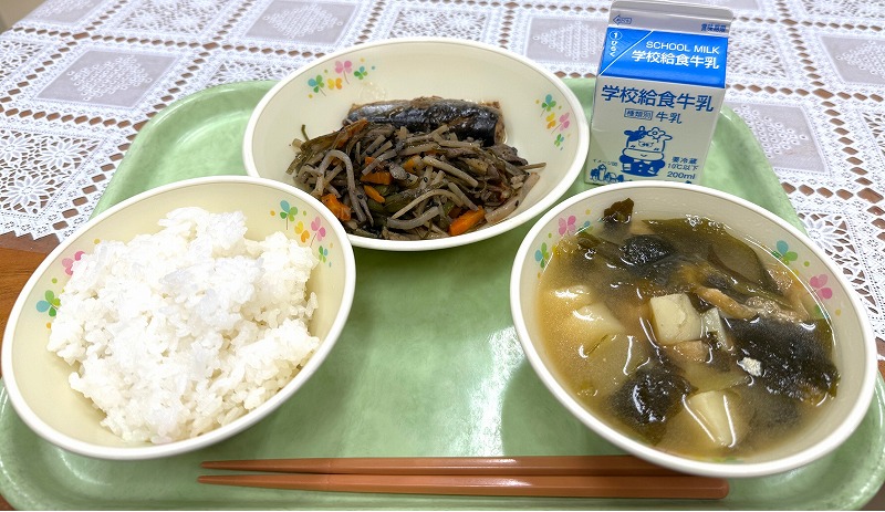 今日の給食です♪ メニューは「いわしのしょうが煮・こぶぴら・じゃが芋とわかめのみそ汁・ごはん・牛乳」です♪ 「和食」も最高~ですね♪