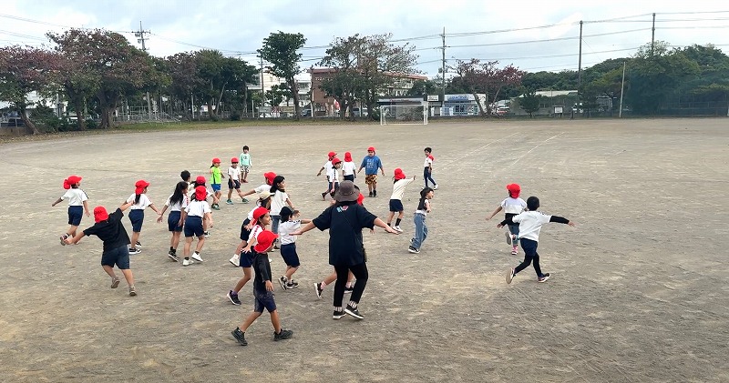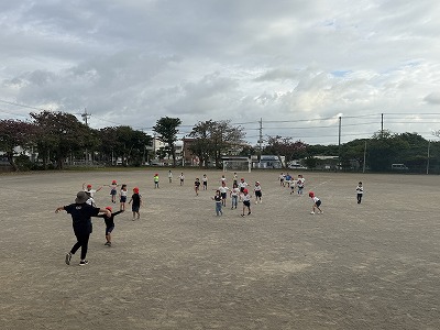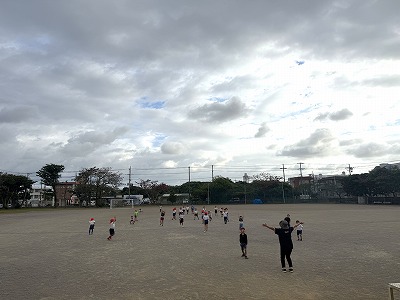 さて、下の画像は1年1組さんの体育の授業の様子です♪ 運動場で音楽に合わせて身体を楽しそうに動かしていました~♪