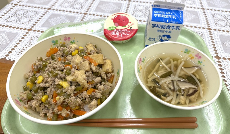 今日の給食です♪ メニューは「彩りそぼろ丼・沢煮椀(さわにわん)・リンゴセリー・牛乳」です♪