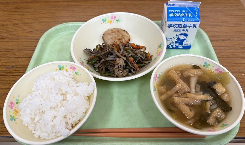今日の給食です♪ メニューは「こぶぴら・キャベツ入り平つくね・きのこのみそ汁・ごはん・牛乳」です♪