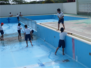 昨日の6年生に引きつづき、今日は5年生がプール清掃を行いました。6年生がプールの側面をきれいにしてくれたので、5年生はプールの底面とプールサイドなどを清掃しました。5・6年生のがんばりで、プールは見違えるようにきれいになりました。