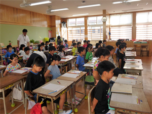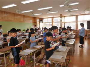3年生の教室では、今月の詩や国語の教科書の音読、かけ算の練習が行われました。
