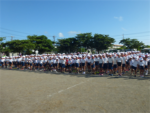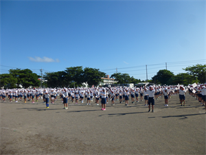 台風13号の影響を受け、なかなか運動場で練習ができなかった運動会に向けての練習。今週は天気も持ち直し、運動場での練習を再開しています。今日の1校時は、運動場で「校歌ダンス」や「閉会式」の練習が行われました。