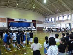 全校児童で、今月の詩を音読し、今月の歌「気球に乗ってどこまでも」を歌いました。