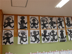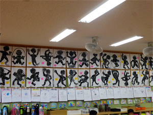 1年生の教室には、出来上がった作品がずらり。いきいきと自分を表現しています。