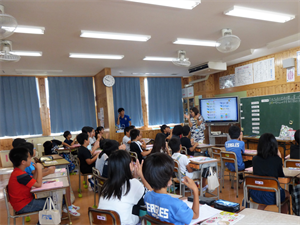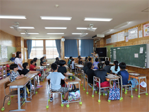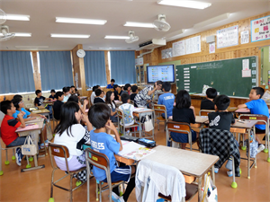 今年度から、本校にも英語専科の先生が配置され、3年生以上で外国語活動が行われています。今日は5年生の教室で、英語専科の先生とALTの先生のTTの授業がありました。授業のテーマは、「①ALTの自己紹介を聞いて楽しもう!②何が好きなのかたずねたり答えたりしよう!」でした。