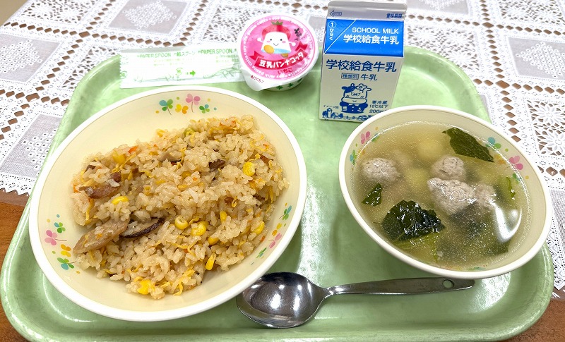 今日の給食です♪ メニューは「中華風つくねの甘酢あんかけ丼・たまごスープ・牛乳」です♪