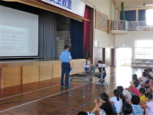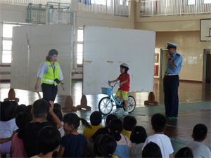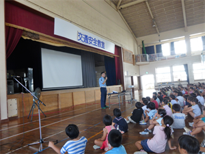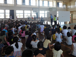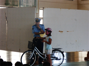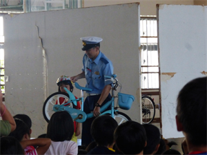 夏休みを前に、学校では交通安全教室が行われました。今回のねらいは、「自転車の正しい乗り方と交通安全指導」です。八重山警察署交通課のおまわりさんと交通安全協会の指導員をゲストティーチャーにお招きし、講話と安全指導をしていただきました。