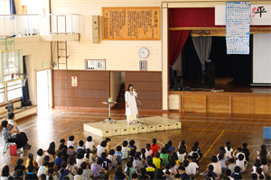 今日の3校時は、体育館で「平和集会」が行われました。集会では、沖縄戦で亡くなったすべての御霊に黙祷した後、登小っ子全員で平和の誓いをしました。そして、平和集会のゲストとしてお招きした 国吉なおみさんによる語りと歌がありました。集会最後には、みんなで「月桃」を合唱し、平和への誓いを新たにしました。
