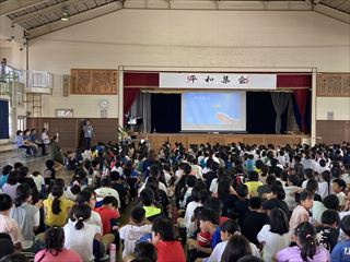 平和集会では、全児童での「平和の鐘」の朗読や「月桃」の合唱を行いました。