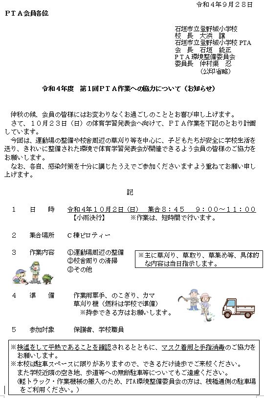 来る10月2日(日)に、体育学習発表会にむけてのPTA作業画が行われます。
