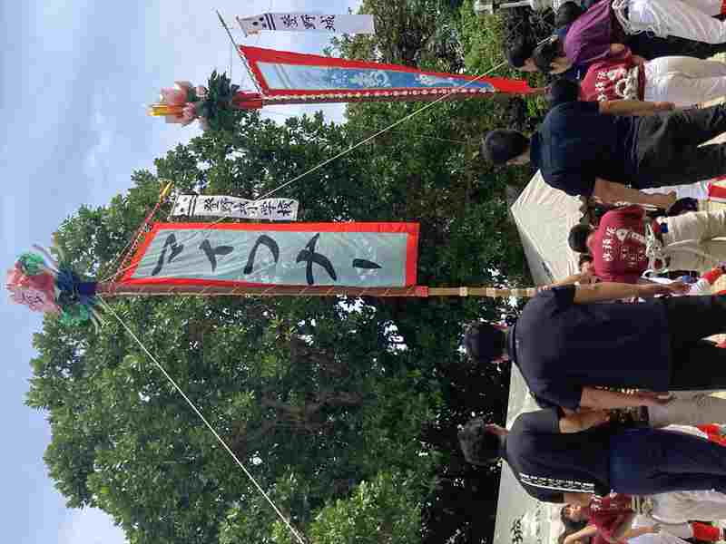 7月から地域の方達に教えてもらいながら、旗頭奉納の練習を始めました。