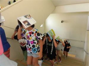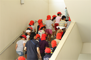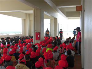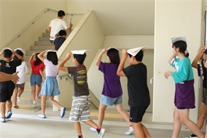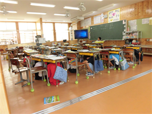 地震・津波による本校の第2次避難場所は、校舎の4階です。緊急放送の避難指示に従い、登小っ子全員が無事に4階に避難しました。避難後は、全体で避難の様子や避難するときの約束が守れたかの振り返りが行われました。