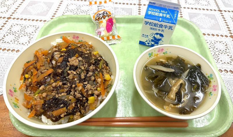 今日の給食です♪ メニューは「もずく丼・ごぼうのみそ汁・さつまポテト・牛乳」です♪