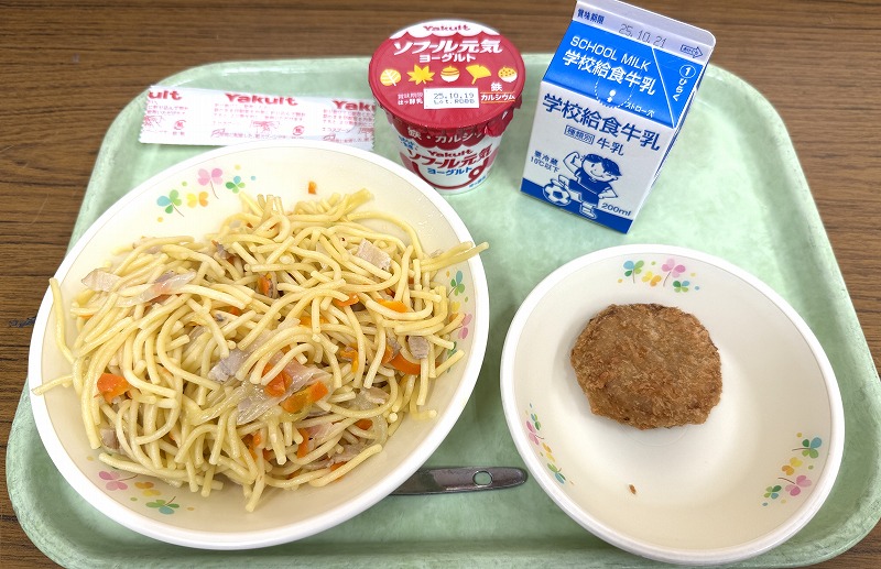 今日の給食です♪ メニューは「ペペロンチーノ・国産キャベツのメンチカツ・ソフール元気ヨーグルト・牛乳」です♪