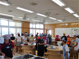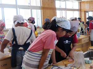 各グループに分かれ、調理の手順を確かめながら実習を進めていました。