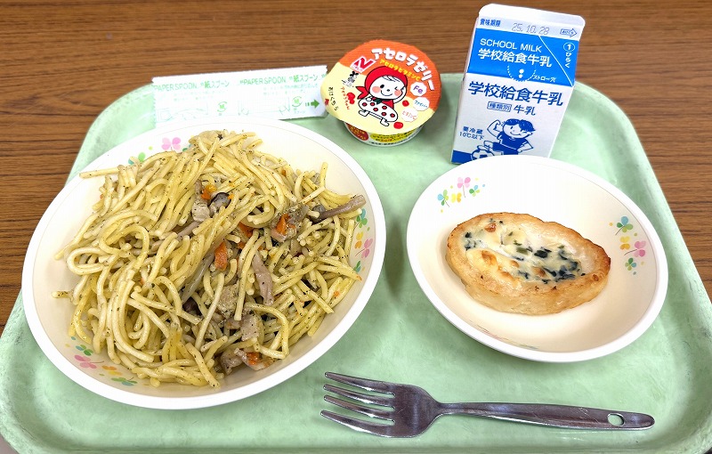 今日の給食です♪ メニューは「バジルスパゲッティー・ポテトカップグラタン・アセロラゼリー・牛乳」です♪