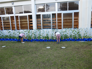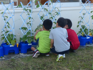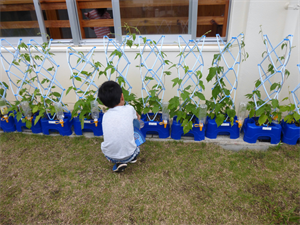 4月に植えたアサガオが、ぐんぐんつるをのばしています。アサガオに水やりをしながら、「先生、ぼくの支柱にお友達のつるがからまりそう」「自分の身長よりもつるが長いよ」と、先生やお友達に話しかけている姿がみられました。