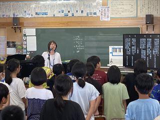 今日の5・6校時に国吉なおみさんのコンサートが行われ、4学年の児童達が参加しました。