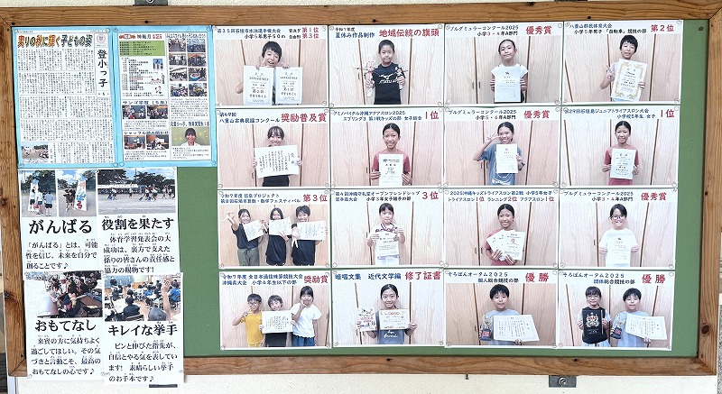 今日の天気は「晴れ 時々 くもり」、最高気温は32度、最低気温は28度(体感温度は31度)でした♪こちらの画像は、職員室入り口横にある児童の皆さんの活躍を称える掲示板です♪ 「〇〇で賞を取りました!」と、報告に来てくれる度に、児童の皆さんの輝く瞳と、努力する姿が目に浮かび、とても嬉しくなります♪