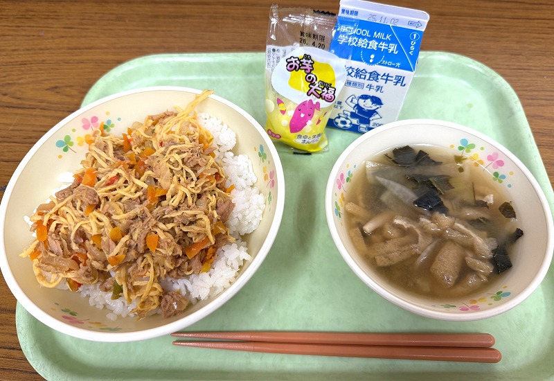今日の給食です♪ メニューは「マグロそぼろ丼・小松菜みそ汁・お芋の大福・牛乳」です♪