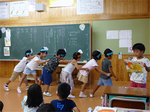1学期のまとめに取り組んでいる登小っ子。1年生の教室では、「おおきなかぶ」の音読発表会が行われていました。ナレーターと登場人物に別れ、おおきなかぶをぬくまでを動作化して発表しました。