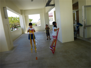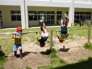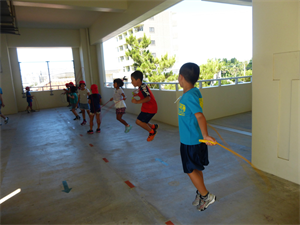 チャレンジデーに、全校児童でなわとびをしてから、休み時間になわとびに挑戦する子が増えました。竹馬や鉄棒遊びにも挑戦しています。