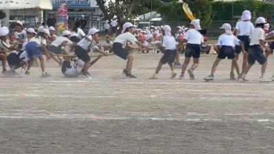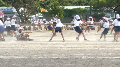 今日の天気は「晴れ 時々 くもり」、最高気温は33度、最低気温は26度(体感温度は31度)でした♪ さて、こちらは3年生の五色綱引きの様子です♪転んで砂まみれになってもロープを放さない一生懸命な姿にも感動しました~(^^)/