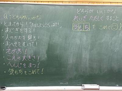 「とまってから、おはようございます!」「お辞儀をする!」 「人の顔を見る!」 「おへそを向けて!」 「笑顔!」 「声の大きさ!」 「返事をまつ!」 そして、最後にみんなで決めた「気持ちをこめて!」