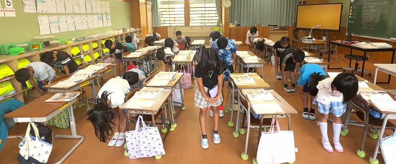 キレイに揃ったお辞儀は、児童の皆さんの真剣な気持ちと、チームワークの素晴らしさを表していますね♪ところで、登小っ子の皆さん、お辞儀には種類があるのを知っていますか?一番軽い「会釈(えしゃく)」は、廊下ですれ違う時などに使う約15度の軽いお辞儀。今日の皆さんのように、感謝の気持ちを伝える「敬礼(けいれい)」は約30度。一番丁寧な「最敬礼(さいけいれい)」は、お礼や謝るときなどに使う約45度。このように、角度で気持ちの深さを伝えることができるんですよ♪お辞儀は、言葉がなくても相手に「尊敬しています」「ありがとう」という気持ちを伝える素晴らしい日本の文化です。練習で身につけた美しいお辞儀を、体育学習発表会だけでなく、日ごろのあいさつにも生かしてくださいね♪今日も皆さんの姿、本当に素晴らしかったです! 明日のリハーサルも笑顔で顔晴ろうね~(^^)/