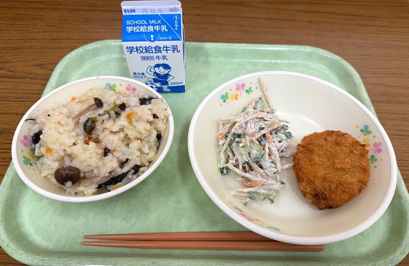 今日の給食です♪ メニューは「鶏ぞうすい・男爵コロッケ・ごぼうサラダ・牛乳」です♪