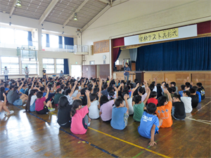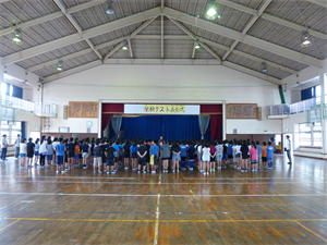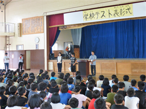 今日は、5・6年生の学校テスト表彰式が行われました。各学級の代表児童が、校長先生から合格証を受け取り、1学期がんばったことに対してお褒めの言葉をいただきました。