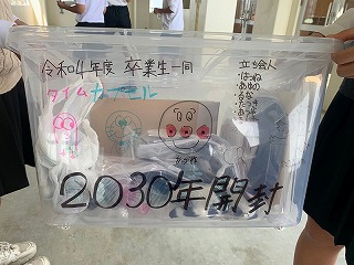 なお同時に児童会役員でタイムカプセルの封の儀を行いました。開封は卒業生が20才になる令和12年(2030年)開封の予定です(^o^) (卒業生のみなさん、覚えておいてね!)
