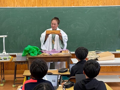 今日の6校時、クラブ活動の時間に「地域クラブ」の講師として、石垣市文化財指定宮鳥御嶽(メートゥルオン)の神司  小川 喜美江 様を招聘し、「豊年祭」についてのお話をしていただきました。