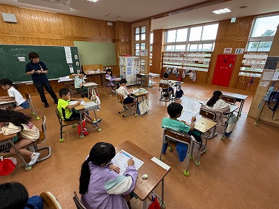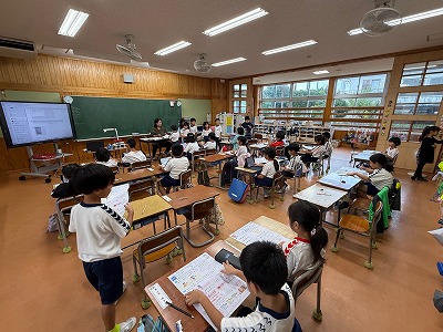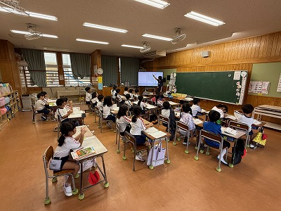 1年3組、国語の授業です。今日は「おもい出して かこう」ということで、文章の書き方について学習に取り組んでいました(^^)/