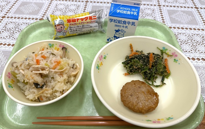 今日の給食です♪ メニューは「鶏ぞうすい・発芽玄米入り平つくね・ほうれん草のごま和え・米粉ドッグ・牛乳」です♪