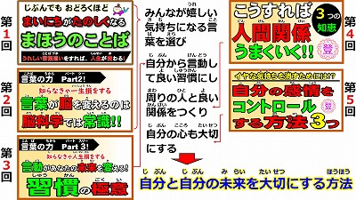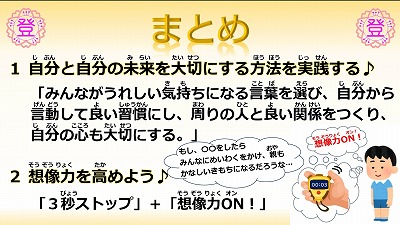 4月からお話ししてきたのは、「言葉の力」と「良い習慣の大切さ」です。「嬉しい言葉づかい」をすること(楽しい!、おもしろい!など)は、心と体を健康にし、人への優しさにつながります。逆に「つまんない」「めんどくさい」といったネガティブな言葉(チクチク言葉)は、心身にも悪影響を及ぼし、人間関係まで悪化させる危険性があります。良い習慣(あいさつ、言葉遣い、学習、読書など)は、自ら進んで行うことで、理想の未来を築く土台となることを伝えました。