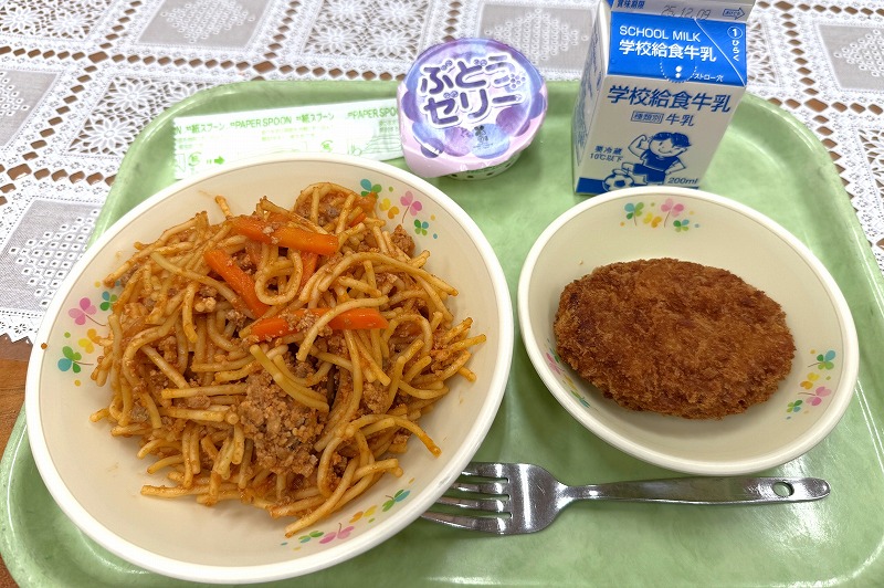 今日の給食です♪ メニューは「スパゲッティミートソース・牛肉コロッケ・ぶどうゼリー・牛乳」です♪ 牛肉コロッケは食べ応えもあり、と~っても美味しかったです! 本日も美味しくいただきました♪ ごちそうさまでした(^^)/