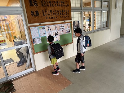 教室に行く前に、掲示物やモニターの動画を見て楽しむ児童の皆さんです♪