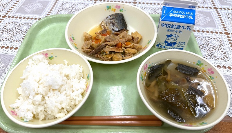 今日の給食です♪ メニューは「厚揚げのカレー炒め・さば生姜煮・きのこのみそ汁・ごはん・牛乳」です♪