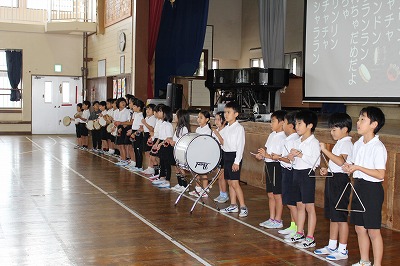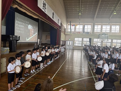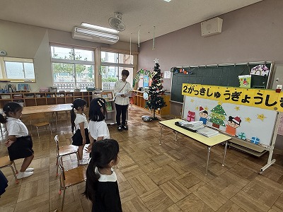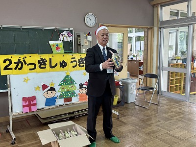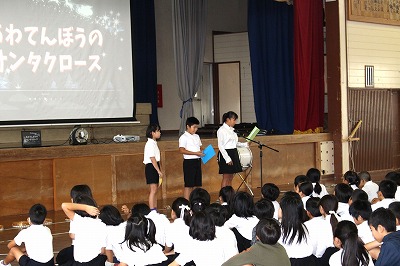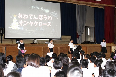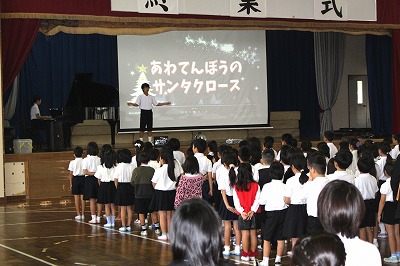 式の最後に、今日はクリスマスということで、2年生の打楽器に合わせて、「あわてんぼうのサンタクロース」を楽しく歌いました♪