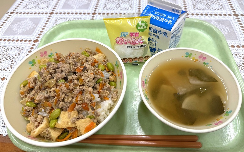 今日の給食です♪ 「ジューシー・千草焼き・ほうれん草の和え物・アーサ汁・牛乳」です♪