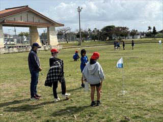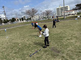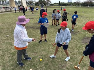今回5年生はグラウンドゴルフを一緒に楽しみました。はじめは少し緊張した様子の子どもたちでしたが、打ち方のこつを教えていただいたり、励ましの言葉をかけていただいたりする中で、次第に笑顔が広がりました。