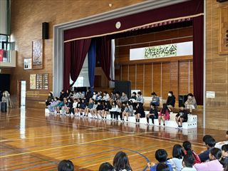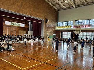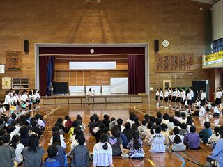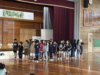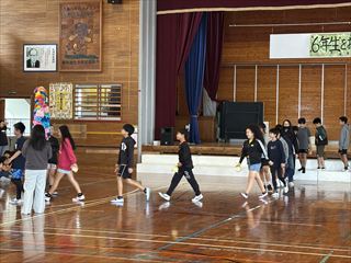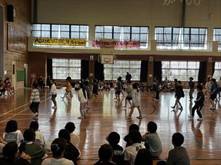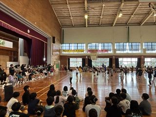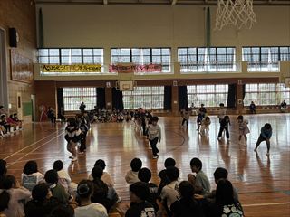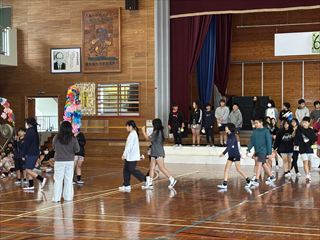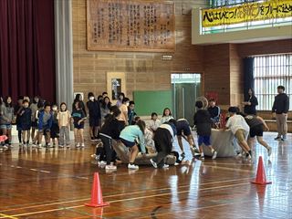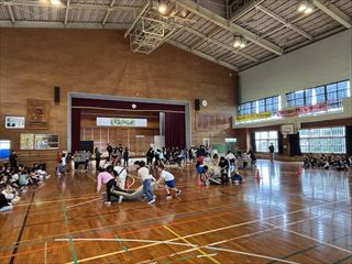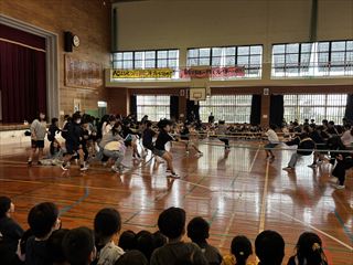 1年生からは心をこめて作ったプレゼントが贈られました。2年生と3年生は元気いっぱいのダンスを披露し、会場を盛り上げました。4年生は6年生をマットの上に乗せて運ぶ「マット運び」を行い、会場は大いに盛り上がりました。5年生は6年生との綱引き対決を行い、力いっぱいの勝負が繰り広げられました。