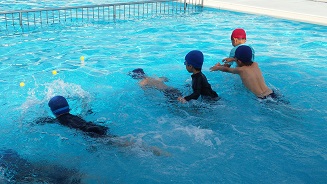 高学年に分かれて、プールでのポートボールを楽しみました。